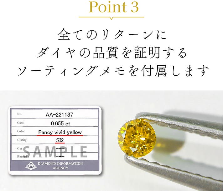 ※一部に「Fancy Vivid Orange Yellow」が含まれる場合がございますが、いずれもイエローダイヤに分類され、美しさや品質に違いはありません。
