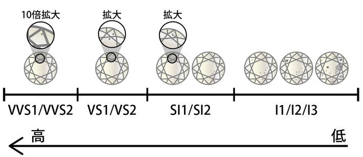 内包物(インクルージョン)や傷の有無を評価、FL(完全無欠)〜I(肉眼でも確認できる)までの等級があります