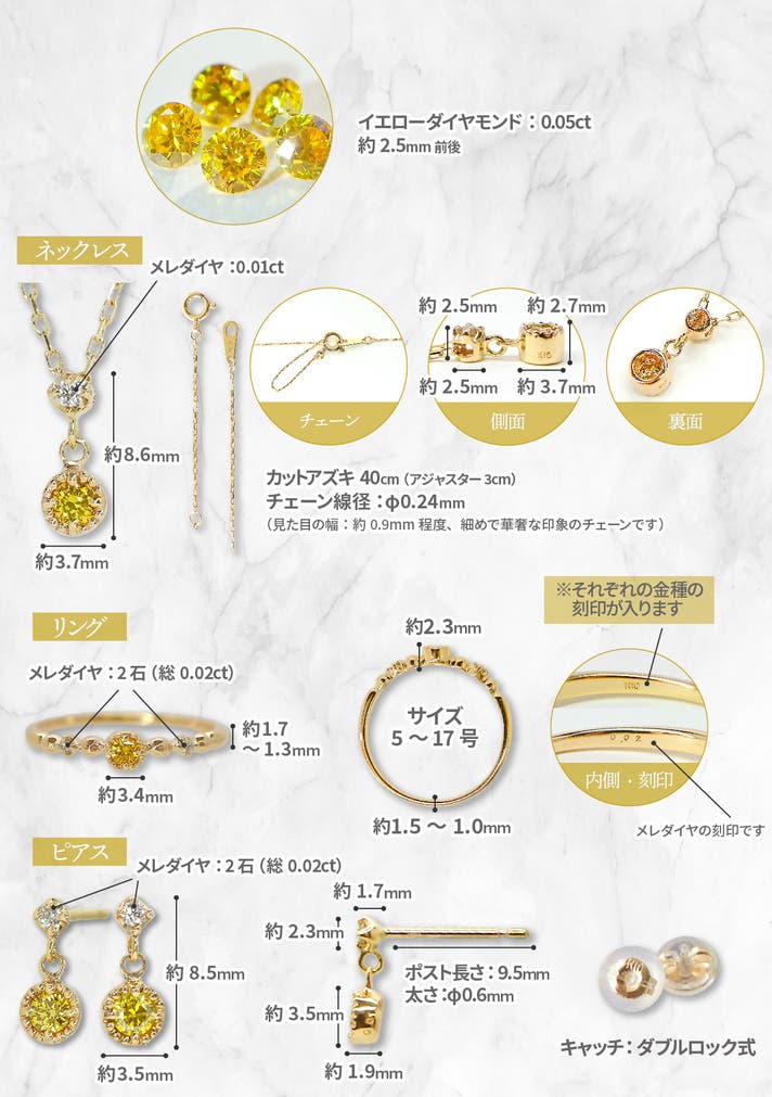 イエローダイヤモンド:0.05ct UP(2.5mmφ前後石によって若干の個体差がございます)