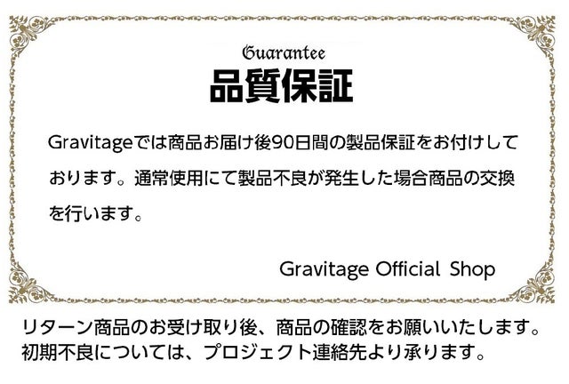 製品保証として、お届け日から90日間の弊社による保証がございます。製品不良が要因と想定される不良及び、通常の使用の範囲内での使用方法による破損の場合保証対象となります。不良の場合、新品と交換対応させていただきます。初期不良の場合は製品到着より1週間以内にご連絡ください。当プロジェクトのMakuakeメッセージにてご連絡を承ります。
