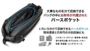 A:ペットボトルや折り畳み傘が入ります。入口にはメッシュの蓋があり、ボトルが落ちないようになっています。ボトルポケットはフロント収納とメイン収納の間にあります。ボトルが入るとメイン収納のマチを拡張させることで収納スペースを確保できます。左右から入れた場合、中で仕切りがあり上下にすれ違う形で収まり、外から見えなくなります。入口高さ:13cm 深さ:下22-上27cm