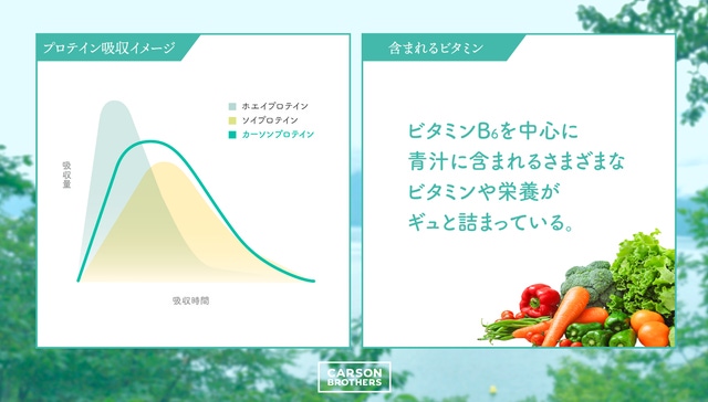 カーソンブラザーズのグリーンプロテインはタンパク質だけではなく、良質なビタミン食物繊維も必要と考え、大葉やケール、つまり青汁を配合。