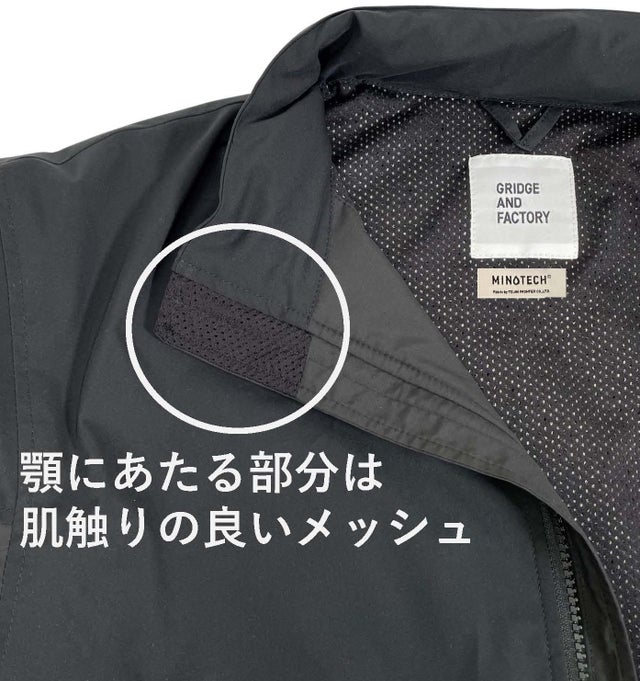 フード部分の生地も『MINOTECH』素材なので雨が転がり落ちます。