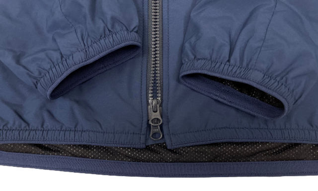 4:フロントファスナーはダブルスライダー、袖口と裾はゴムシャーリング仕様。