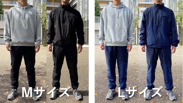 左:Mサイズ着用(ちょうど良いサイズ感)、右:Mサイズ着用(少しゆったりなサイズ感)
