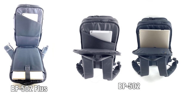 ※BP-502 はPCエリアが180度 全開しません。またノートPCの収納ポケットがありません。