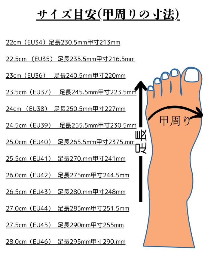 22.0〜28.0cm(0.5cm刻み)(メンズ、レディース兼用)