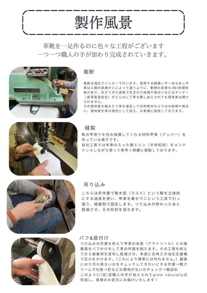 『国内素材調達』『国内縫製』『国内雇用』『伝統継承』は日本の革靴業界でも必要と認識して 【grow naturally】 を提案致しております。