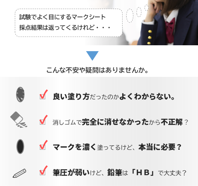 「マーク濃度判定マークシート」はマークシート用紙と読取機(OMR)を活用して、あなたが塗ったマークを判定して、結果をお返しするサービスです。