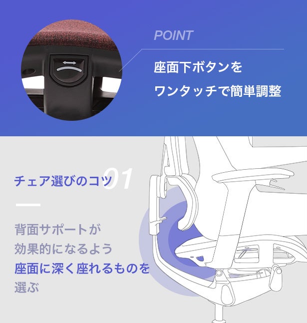 チェアに深く座るとランバーサポートをより効果的に使える為、