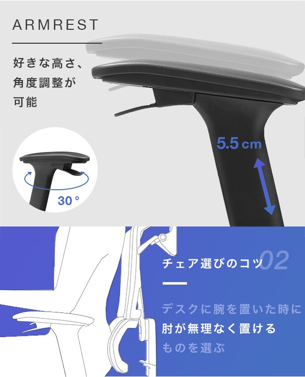 更に、アームの上下調整が出来るものを選ぶと身体に合わせる事ができるので、腕や肩を楽に置いて作業できます。チェアをデスクに収納する際にもアームのデスクへの干渉を防ぐ事もできます。