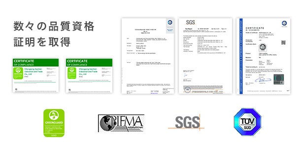 BIFMA、SGS、GREENGUARD認証などの主要な世界品質基準を満たし、数々の品質証明書を取得しています。