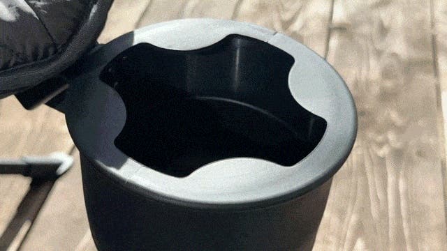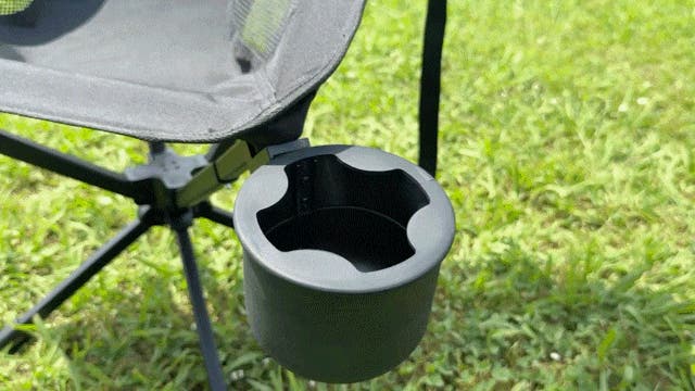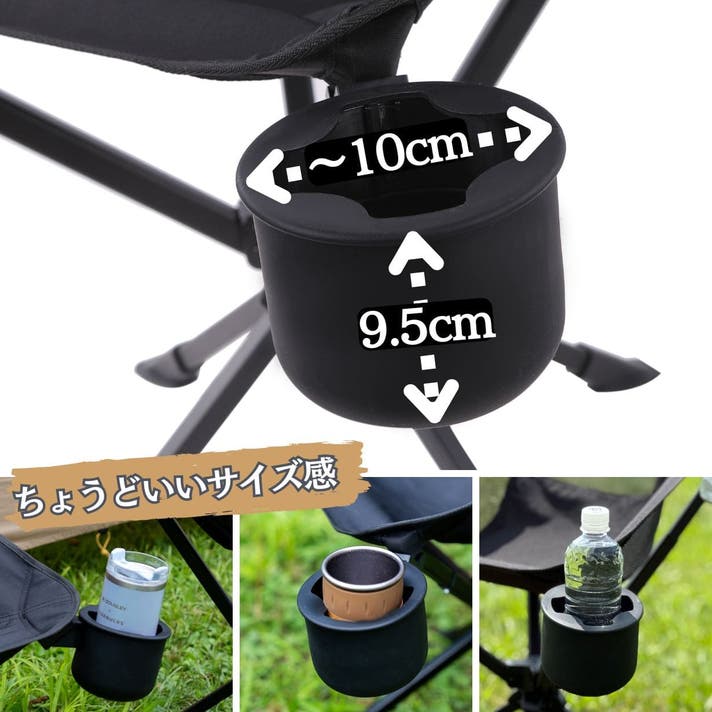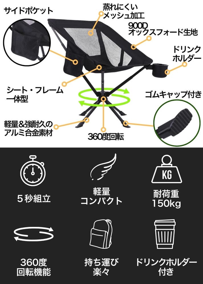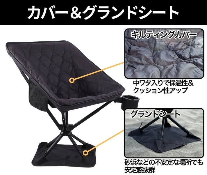 組み立てはわずか5秒。フレーム一体型で迷わず設営。 快適な座り心地に加え、360°回転、安定感のあるドリンクホルダー、専用グランドシートまで装備。