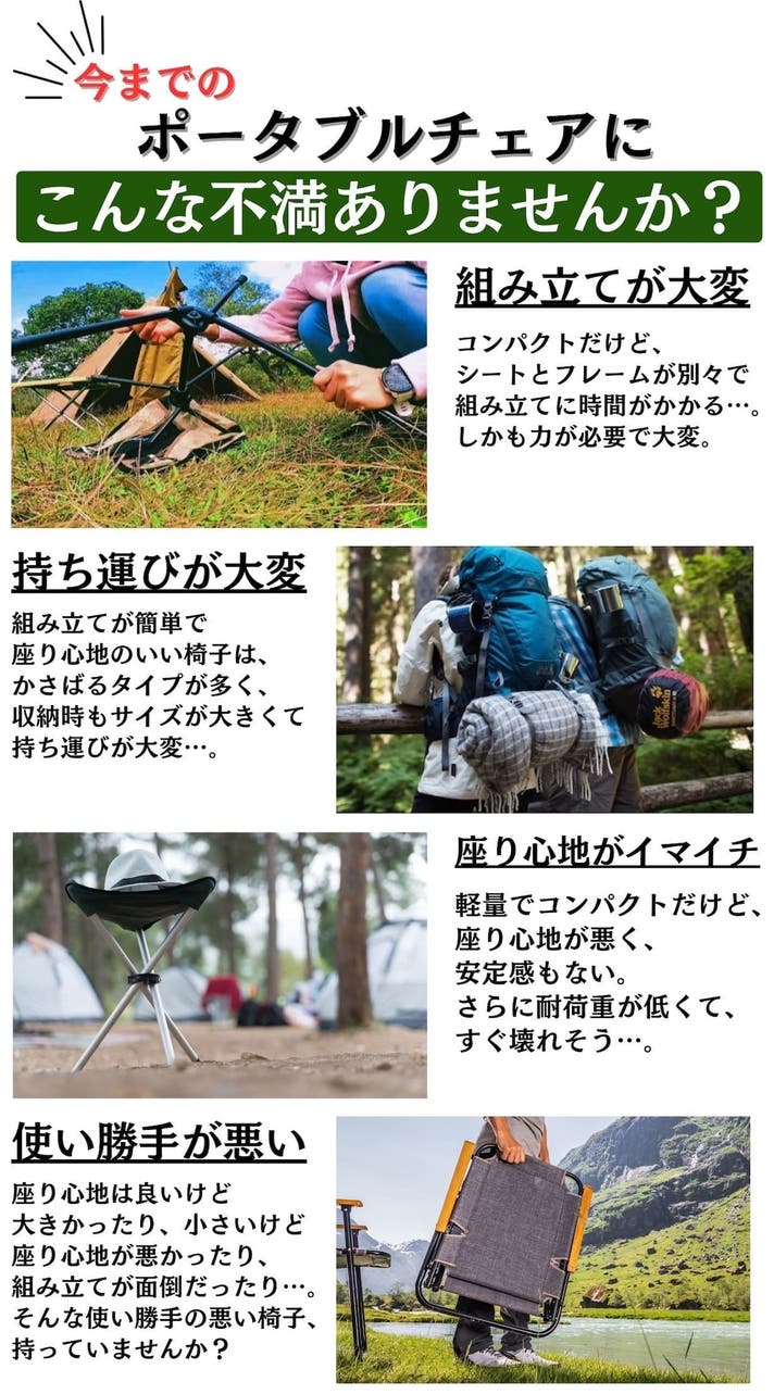 - 【5秒で簡単組立アウトドアチェア】フレームシート一体型で広げて伸ばすだけ!収納も数秒で完了!