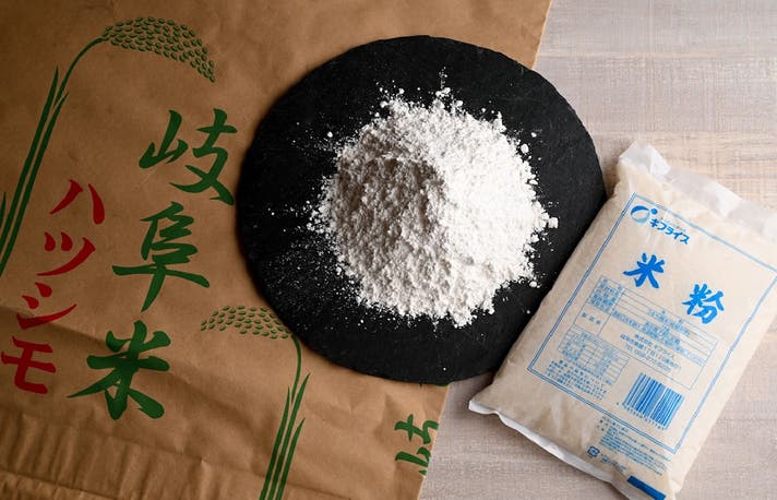 粒が大きくハリがあり、梅雨を過ぎても食味の低下が少ないため人気のお米ですが、収穫量が少なく、しかも産地が木曽川、長良川、揖斐川の三清流の水が流れる岐阜県美濃地方にほぼ限られていることで「幻の米」とも称される「ハツシモ」の米粉を使用しています。