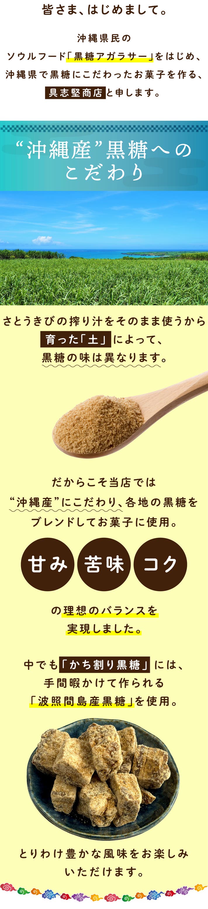 当店は先代から二代にわたって黒糖アガラサーを中心に、沖縄黒糖を使ったお菓子を製造・販売してきました。