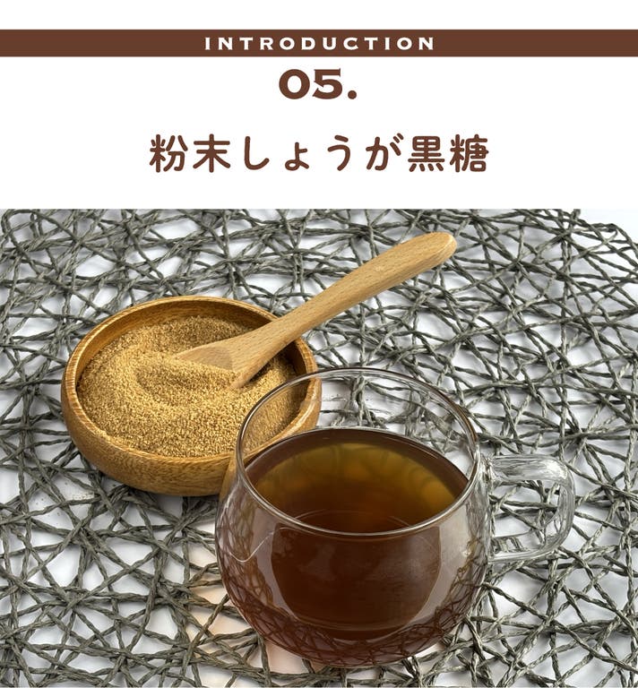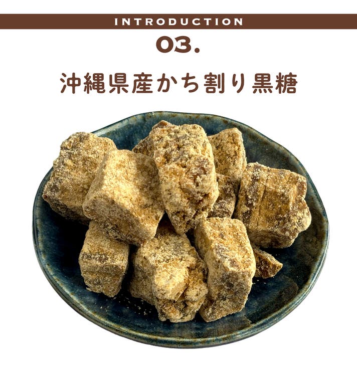 沖縄産の風味豊かな黒糖に生姜の粉末をブレンド。ほんのりピリッとした生姜の刺激と、黒糖のコクのある甘さを楽しめる商品です。