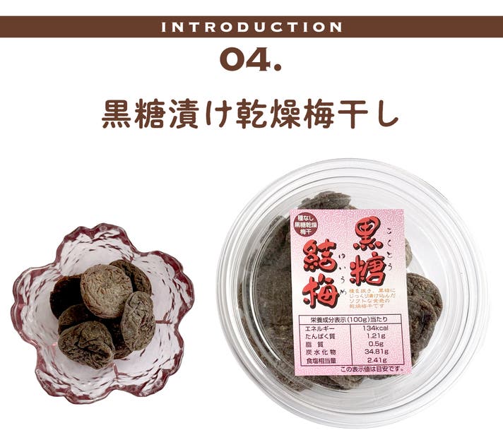 和歌山を中心に、群馬や福井、愛媛などで育った国産の梅を乾燥させ、黒糖の液に漬け込んだのが黒糖漬け乾燥梅干し。