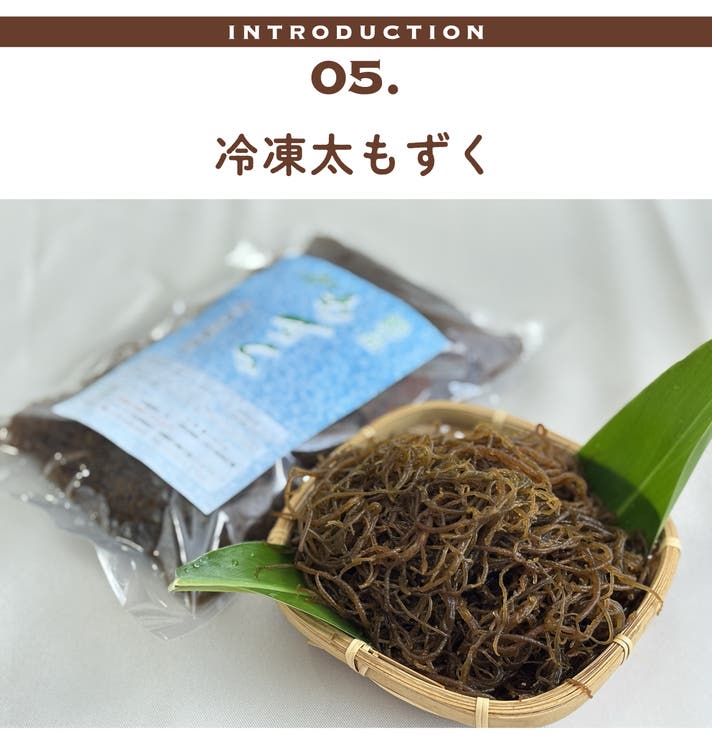 沖縄の美しい海で育った太もずくを、とれたての美味しさそのままに冷凍でお届けします。