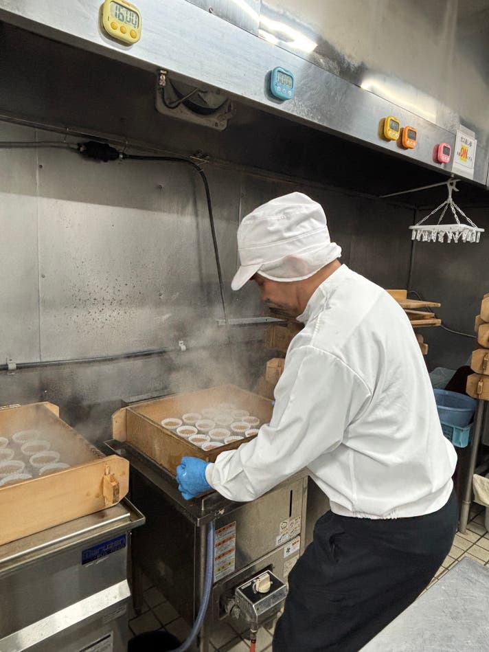 黒糖アガラサーの作り方はとっても簡単。冷水を混ぜて生地を作ったら、付属のカップに流し込み、お湯を張ったフライパンに並べて蒸すだけです。