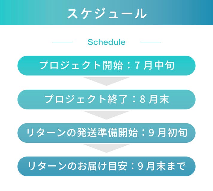 ・開発中の工程において、規格・仕様・パッケージデザイン・栄養成分などが変更になる可能性もございます。あらかじめご了承くださいませ。 ・本文中に記載させていただいたスケジュールは、あくまでプロジェクト公開時点の予定です。応援購入の性質上、配送遅延のおそれがございます。 ・原則として、配送遅延に伴う応援購入のキャンセルはできませんが、リターン配送予定月から 3ヶ月 を超えた場合には、希望者に限りキャンセルにて対応させていただきます。