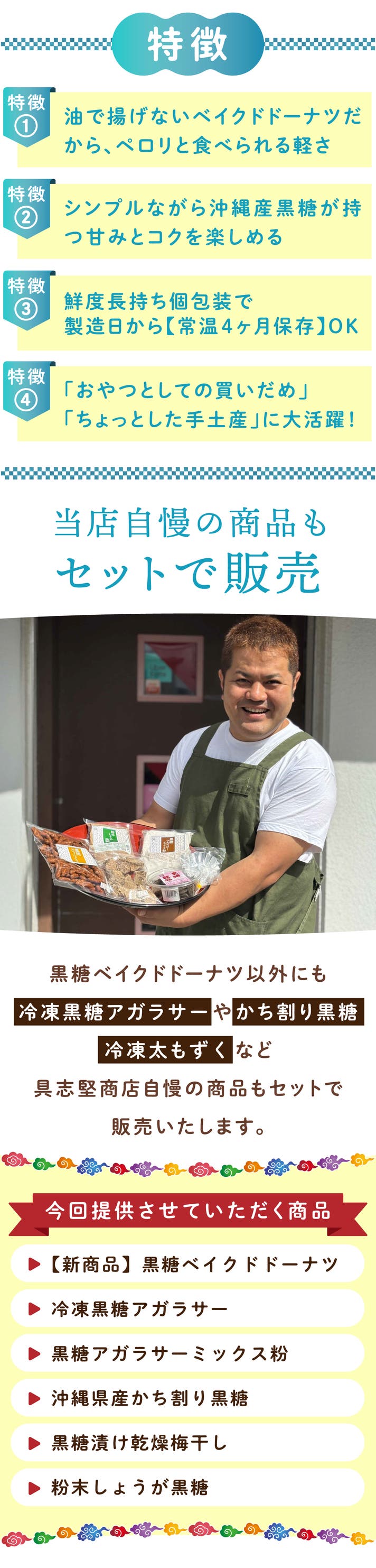 リターンには、新商品の黒糖ベイクドドーナツはもちろん、当店定番の商品や年によっては取り扱いのない太もずくなど、どれも自信を持っておすすめできる商品ばかりを取り揃えました。