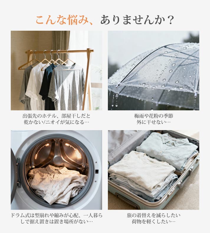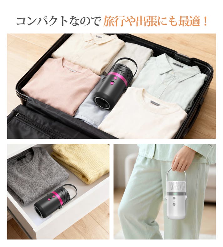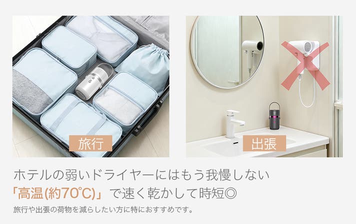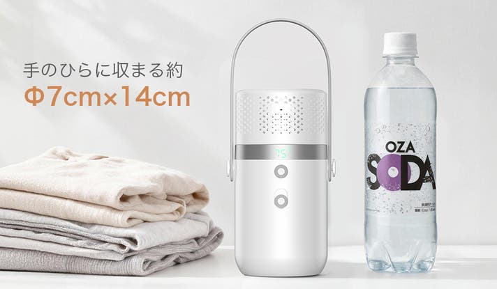 - スーツケースのすき間にすっと入る、ペットボトル級のコンパクト乾燥機