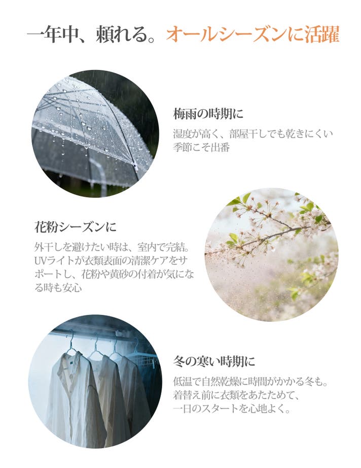 乾燥モード中にUVライトを照射し、衣類表面の清潔ケアをサポート。ホテル滞在や梅雨・花粉の季節にも頼れる“プラス一手”です。