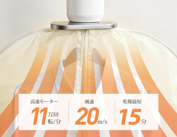 最大約11万回転/分の高速モーターが、太い直線風路を一気に駆け抜ける強い整流風を生成。カバー内の隅々まで風が行き渡り、生乾きの原因となる水分の偏りを抑えます。襟・脇・裾までムラなく乾き、シャツは見映えよく、厚手衣類は時短で。