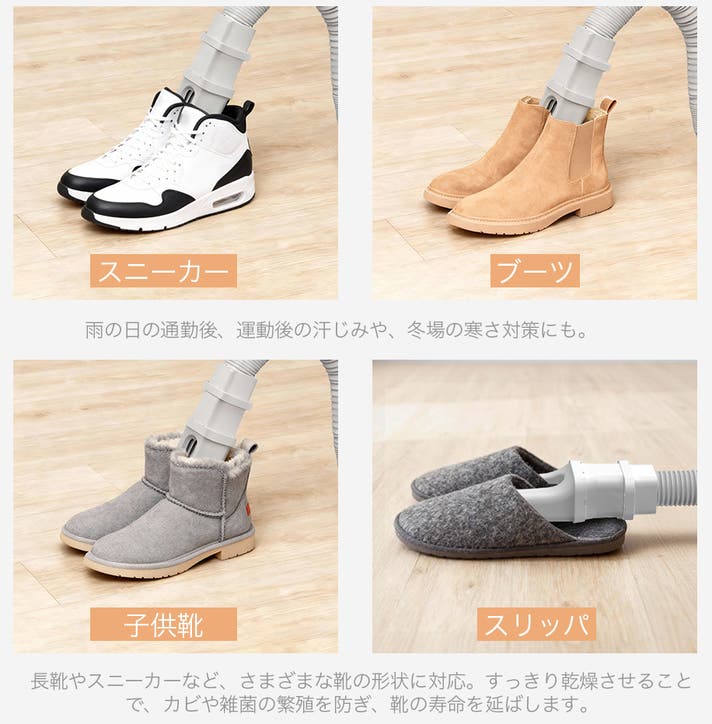 ホースを靴用ヘッドに接続すれば、温風をつま先の奥までダイレクト送風。梅雨や雨の日に濡れたスニーカー、子どもの上履き、洗ったインソール、冬のブーツまで、内部からムラ乾きを抑えて時短で仕上げます。