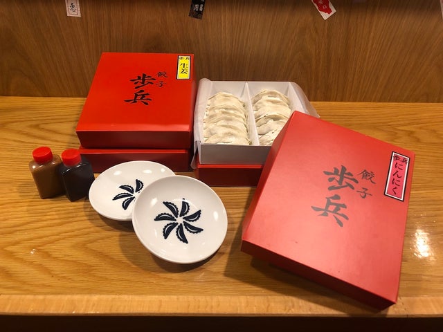 歩兵特製の「生姜ぎょうざ」と「にらにんにくぎょうざ」をお楽しみいただけるパーティーサイズです。当店自慢のぎょうざをオリジナルデザインの小皿でぜひご堪能ください!(お皿は4枚付きです)