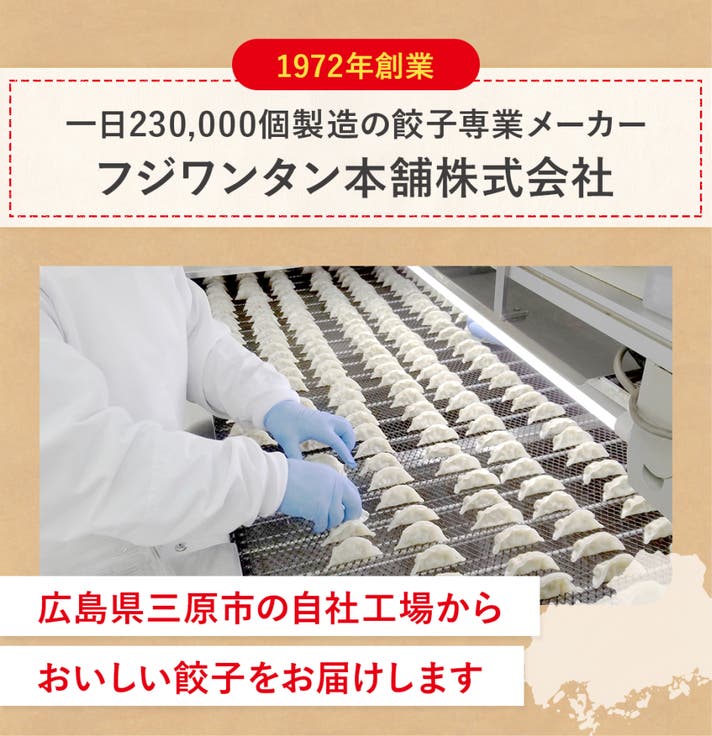広島県三原市にある「フジワンタン本舗株式会社」です。1972年の創業以来、1日23万個以上の餃子を製造し、全国のラーメン店やご家庭にお届けしてきました。2024年10月からは、楽天市場に「ぎょうざほんぽpao」として出店。素材選びから製造まで、すべて自社工場で丁寧に行っています。