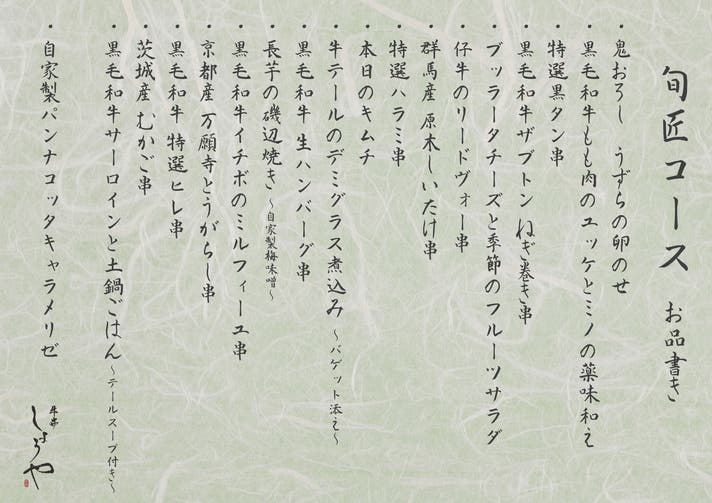 旬の食材、希少部位、趣向を凝らした逸品を組み込んだ最上位コース。味わいの高低や余韻まで計算された構成で、串料理の奥深さをご体感いただけます。大切なご接待や記念日にもふさわしい内容です。