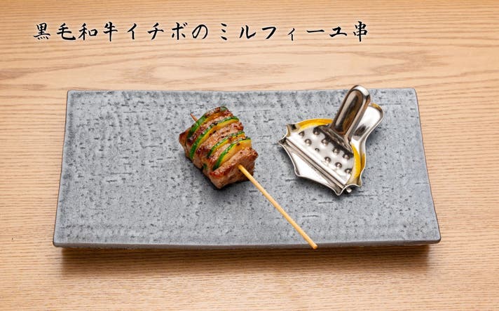 黒毛和牛のイチボにズッキーニを挟んだ一串。ステーキにしか使用しない柔らかな部位を使いミルフィーユ状にズッキーニを挟んで肉の旨みを閉じ込め、あっさりでジューシーに仕上がります。レモンを絞ってお召し上がりください。