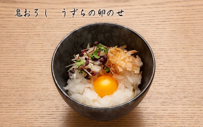 食感を残すよう粗くおろした大根おろしに、うずらの卵と鰹節、薬味を重ね自家製出汁醤油でまとめました。