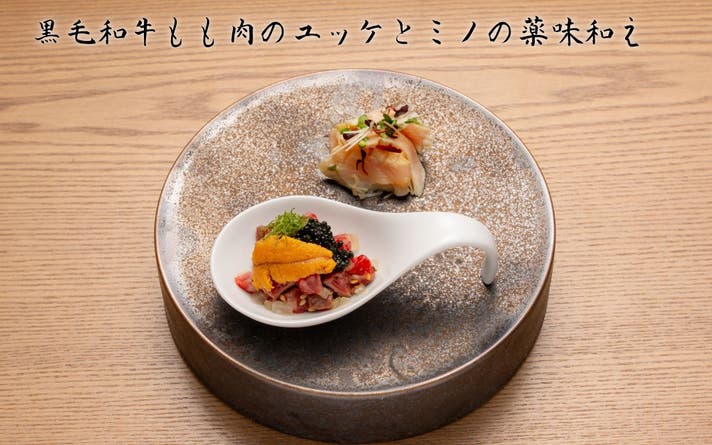 立れんげには黒毛和牛もも肉のユッケに雲丹、キャビアをのせて豪華に召し上がって頂きます。素材の味を壊さないよう塩仕立てでご用意しました。もう1品はていねいに薄切りにした上質なミノをサッと湯引きし酢橘でさっぱりとお召し上がり頂けます。