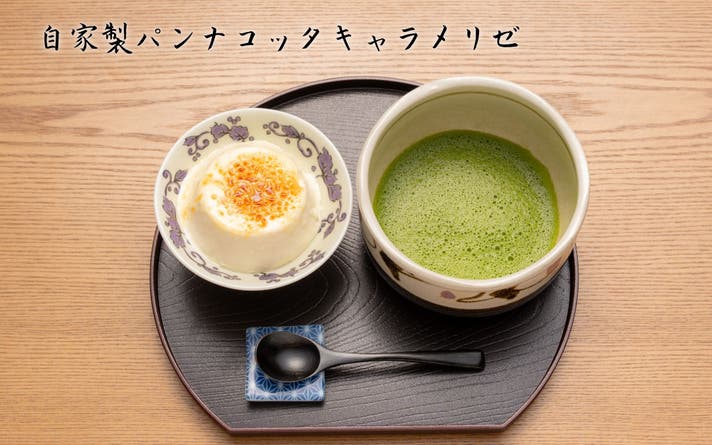 デザートは自家製パンナコッタをキャラメリゼにして食感と上品な甘さを堪能して頂けます。愛知県西尾産の抹茶とご一緒にお召し上がりください。
