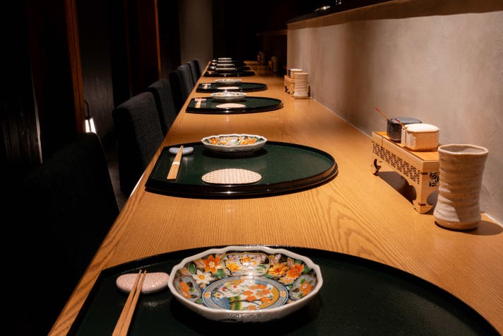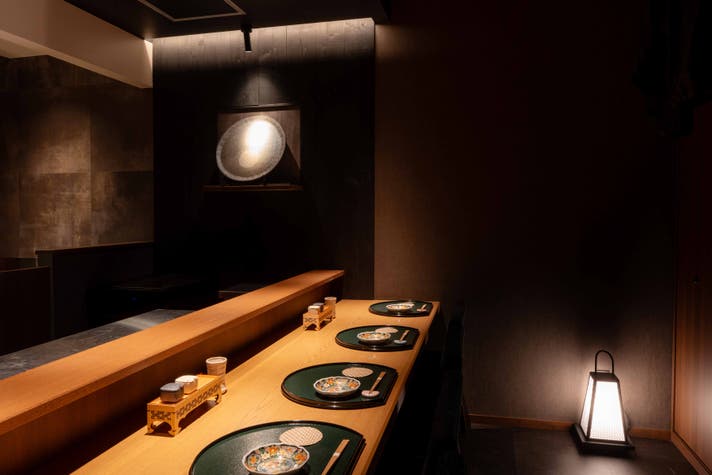 古民家の風情を感じる落ち着いた空間です。カウンターでのライブ感あふれる食事を楽しめ、記念日や大切な人とのひととき、ビジネスシーンにもふさわしい落ち着きがあります。