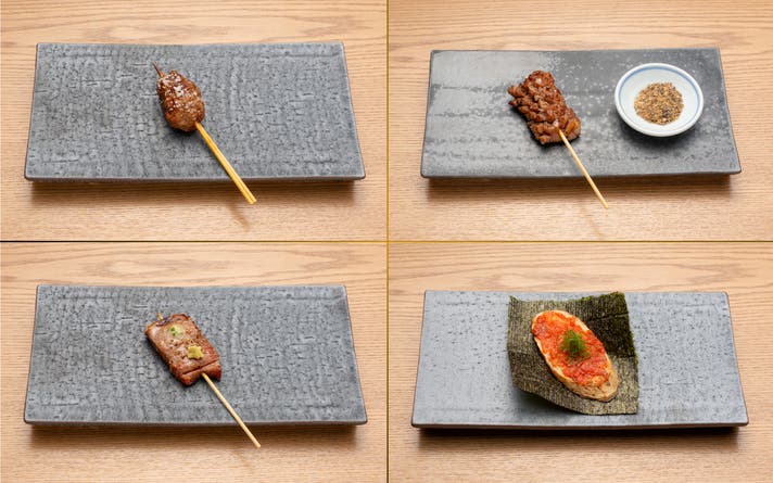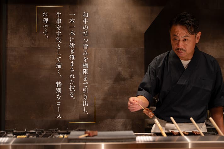 和牛の魅力を最大限に引き出すため、一本一本に緻密な技を施し“牛串” そのものを主役に据えたコース料理として表現。