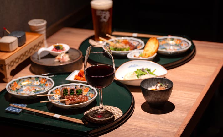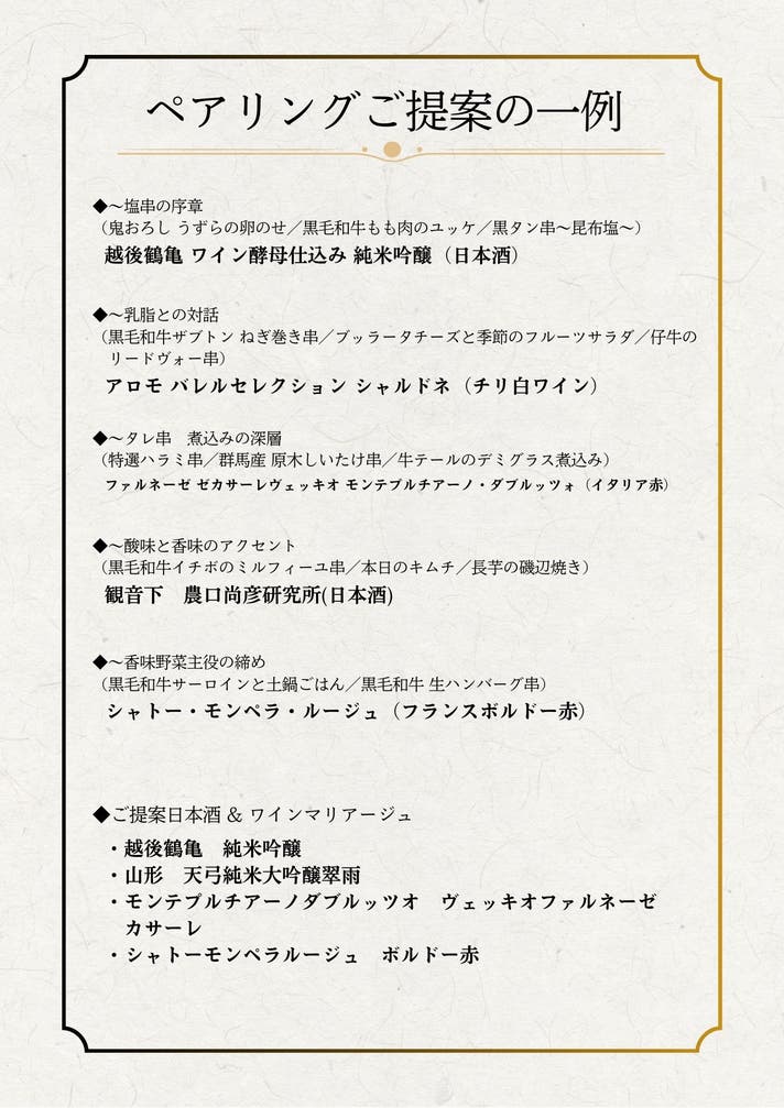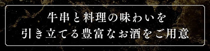 牛串をはじめとしたお料理一品一品の味わいに合わせ、ワインや日本酒など多彩なお酒を取り揃えております。料理との相性を大切にしながらお好みやシーンに合わせてお選びいただけます。お得な飲み放題プランもご用意しており、特別なひとときに華を添えます。