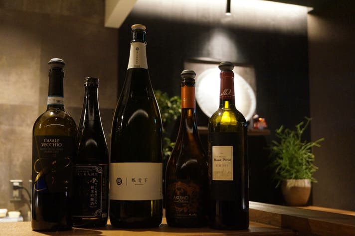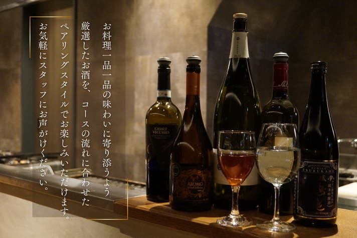 コースのお料理に合わせて楽しめるペアリング用のお酒もご用意しております。気になるお酒があれば、どうぞお気軽にスタッフまでお声がけください。
