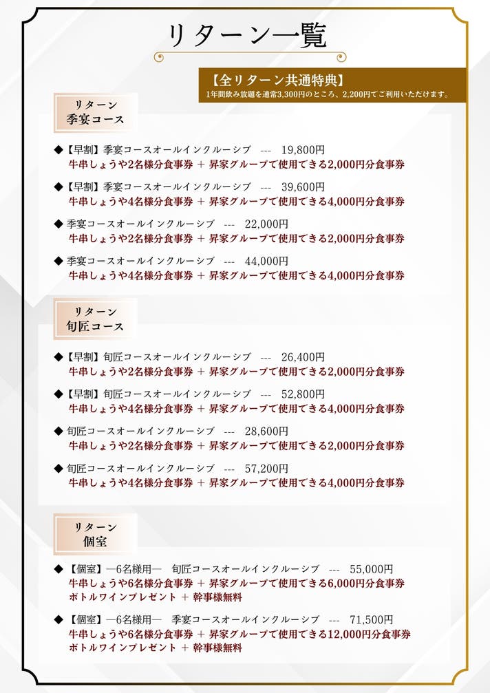 本リターンのお食事券は昇家グループ全店でご利用いただけますのでお近くの店舗でお楽しみください。
