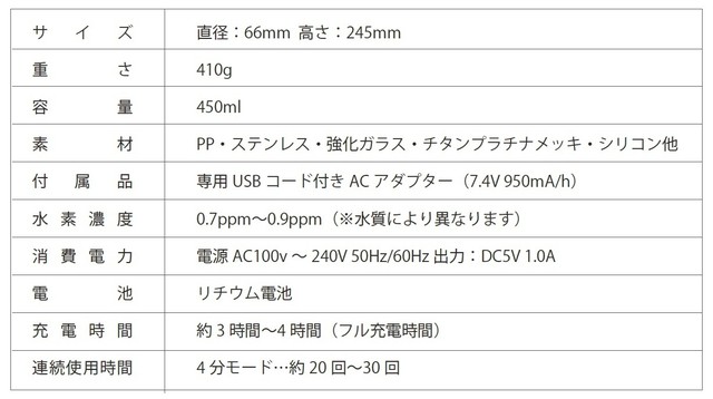 最新型携帯用水素水サーバー「H2plus(エイチツープラス)」+充電器