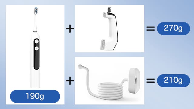 水タンクを付けても約270g、ホースを付けても約210gで、持ち運びもラクラク。
