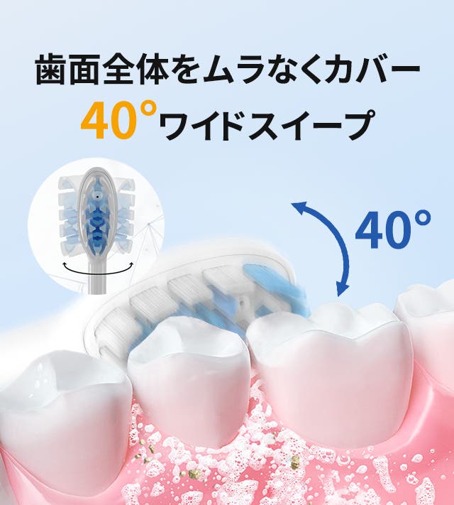 40°のワイドスイープ設計により、歯の表面から歯間まで一度に広くカバーし、効率よくブラッシングが可能。