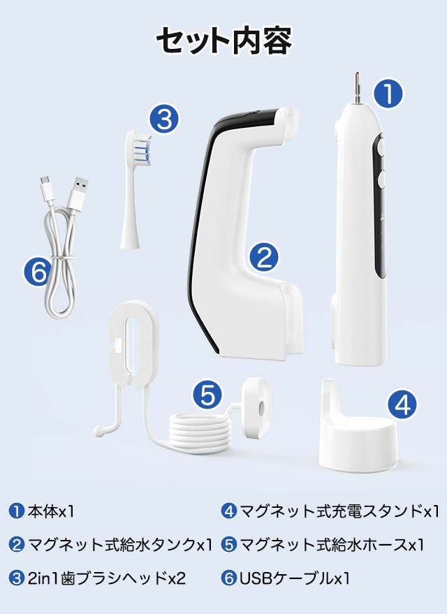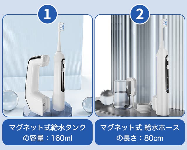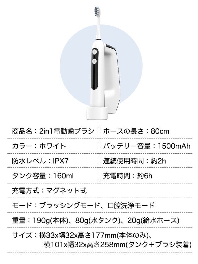 - 歯磨きと高圧ジェット洗浄を1台に集約した、毎日の口腔ケアを効率化する2in1電動歯ブラシです。