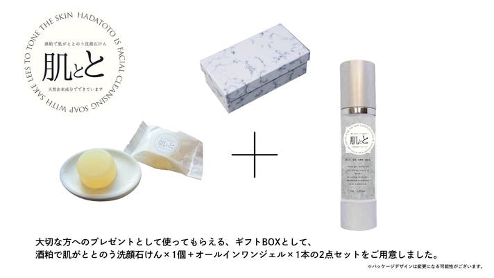 大切な方への贈り物として使ってもらえる、ギフトBOXとして、酒粕で肌がととのう洗顔石けん×1個+オールインワンジェル×1本の2点セットをご用意しました。