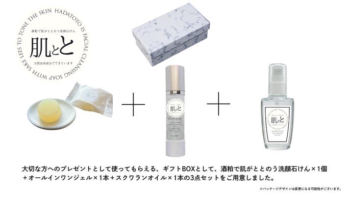 大切な方への贈り物として使ってもらえる、ギフトBOXとして、酒粕で肌がととのう洗顔石けん×1個+オールインワンジェル×1本+スクワランオイル×1本の3点セットをご用意しました。