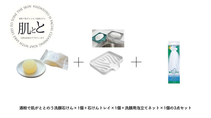 酒粕で肌がととのう洗顔石けん×1個+石けんトレイ×1個+洗顔用泡立てネット×1個の3点セット