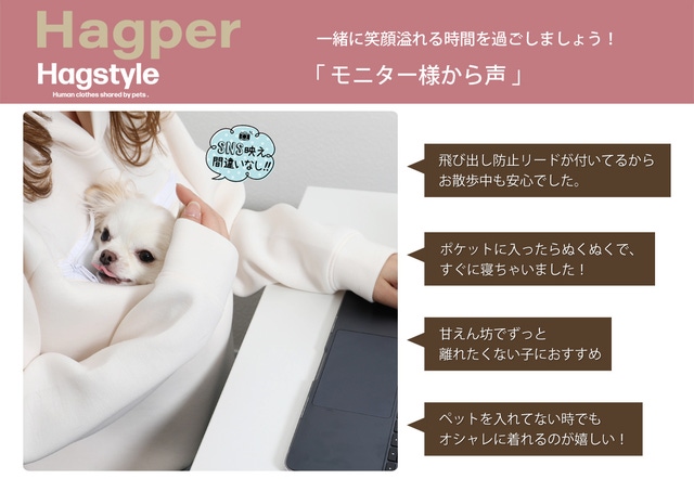 しかし、Hagperがあれば、一緒に行けなかった場所にもお出かけできるようになり、お留守番が減ったり、通院が楽になったり、歩けなくなった愛犬と抱っこ散歩ができたり、生活に希望や喜びを与えてくれます。